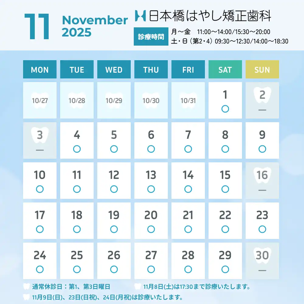 ※11月9日(日)、23日(日祝)、24日(月祝)は診療いたします。