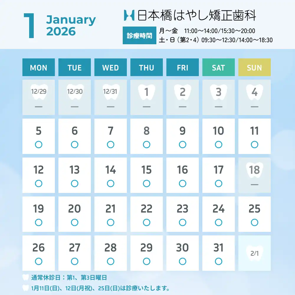 ※1月11日(日)、12日(月祝)、25日(日)は診療いたします。