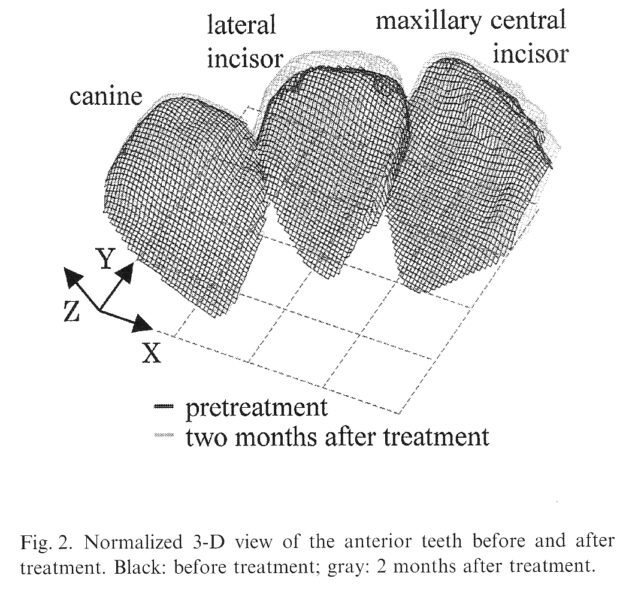 この研究では、3Dスキャナーを用いて治療中の歯列模型を高精度にデジタル化し、各歯の位置を三次元的に比較しました。
