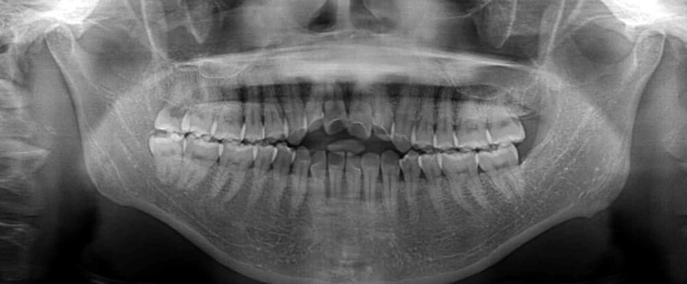 パノラマ写真では、上下顎右側に親知らず(智歯・8番)が確認されました。