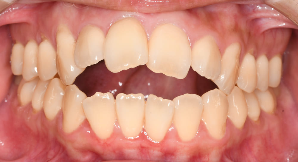正面の口腔内写真では、前歯部の上下的な開き(開咬)が約10mmあり、通常の平均値(オーバーバイト:マイナス2〜3mm)と比べてかなり大きく開いている状態です。