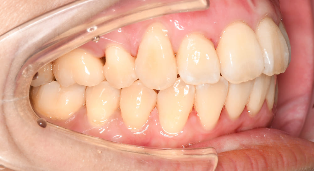 右側の写真でも、前歯部の唇側傾斜(出っ歯)の改善と安定した咬合関係が得られています。